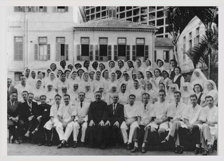 Inauguração do 1º bloco com dois pavimentos e um porão – duas enfermarias no Pavilhão Central, com farmácia, sala de consultas, e sala de cirurgia. Construtor: Prado Lopes, ao preço de 70 contos de reis. Preservado e ocupado por: Engenharia Clínica, SAME, Pesquisa Clínica, Centro de Estudos.